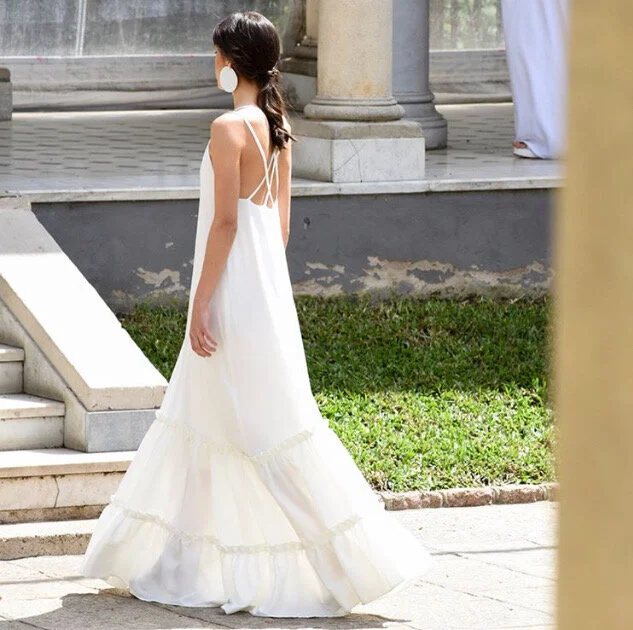 Foto de Camila Montenegro - Vestido cruz en crepe y satén triple con mega volados y espalda cruzada